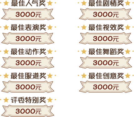 2.双人赛:双人一组进行比赛,不限于剧情、走秀、舞蹈等形式。