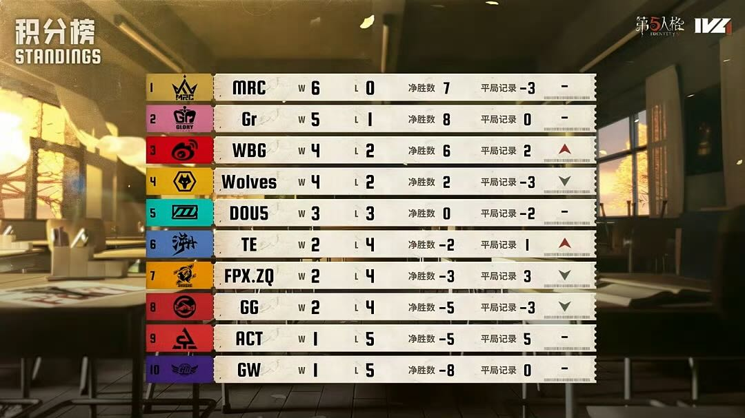 秋季赛第三周的第二日的比赛已经全部结束。TE排名成功上升两位,北京WBG进入积分榜前三名。明日成都Wolves对战Gr、MRC对战北京WBG,强队之间的对决让人无比期待,稳居前四的四支强队的碰撞是否会让前四的排名大洗牌呢?MRC能否保住连胜,坐稳第一的宝座?今日战败的成都GG与GW即将在明日的战场上对决,他们能否重振旗鼓,一展雄姿?让我们一起期待明天的比赛!