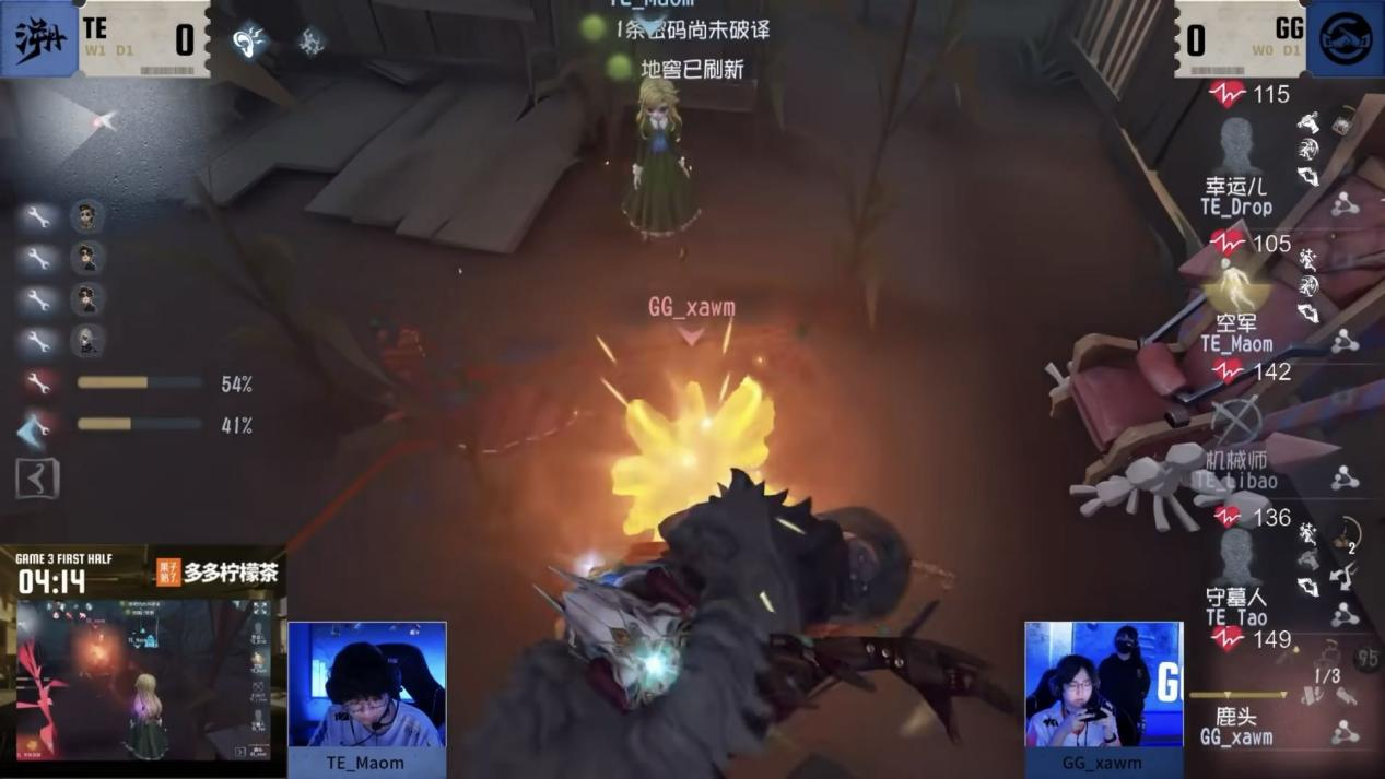 今日第一场TE vs 成都GG第三局上半局GG_xawm鹿头开局追击机械师,中期TE_Maom空军利用信号枪成功牵制监管者为队友争取破译时间,双方围绕密码机展开拉扯,三人开门战守墓人极限救援,幸运儿被留下,最终双方战平。