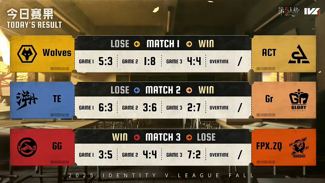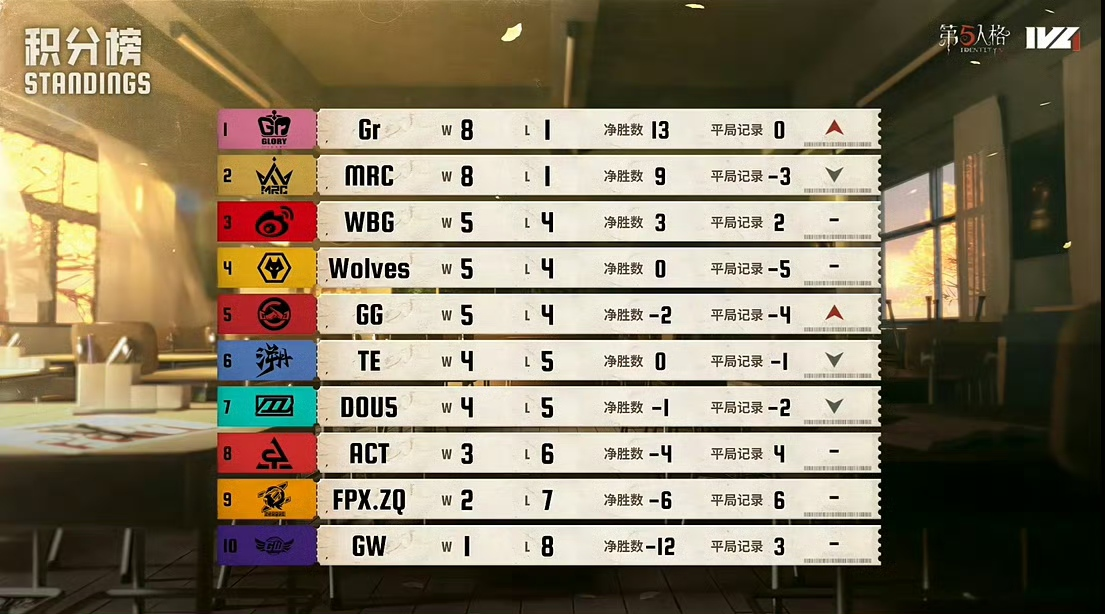 常规赛第五周第一日的比赛真是非常精彩,跌宕起伏。久居倒二倒三的ACT出人意料的战胜了成都Wolves,可以说是逆风翻盘,ACT_zz9的一把四抓奠定胜局,最终绝地反击拿下了今日比赛;TE与Gr的对局也是难分伯仲,胜负易手,双方实力相当,对局中有来有回,然而Gr监管者的两把四抓注定胜局,Gr赢得今日比赛;成都GG与FPX.ZQ的对局胜负难分不分轩轾,最终成都GG后来居上绝地反击,以监管者的一把四抓赢得今日比赛胜利。