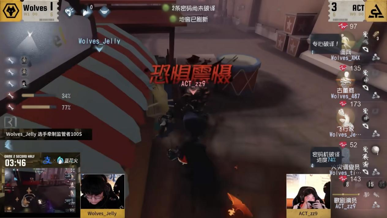今日第一场成都Wolves vs ACT第二局下半局ACT_zz9歌剧演员开局闪现快速击倒飞行家,中期歌剧演员轮番击倒求生挂上椅,不断消耗求生者状态,后期歌剧演员果断失常并成功拦截火灾调查员救援,最终ACT监管者逐个击破完成四抓。