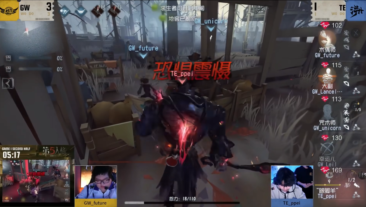 今日第二场TE vs GW。第一局下半局TE_ppei“跛脚羊”开局追击幸运儿,守椅战恐惧震慑木偶师,中期“跛脚羊”消耗求生者状态并干扰破译进度,最终三人开门战TE监管者逐个击破完成四抓。