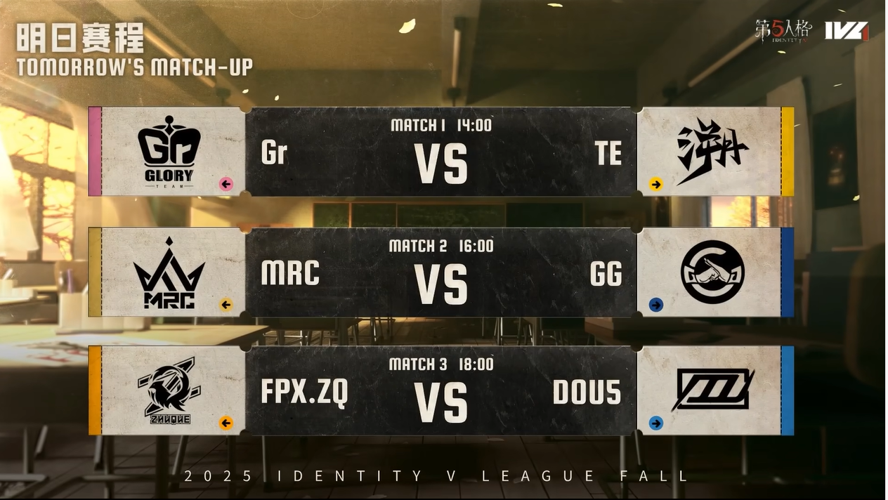 秋季赛第八周第二日的比赛已经全部结束,明日Gr对战TE,究竟是TE赢下比赛再争胜者组之位,还是Gr将积分收入囊中?成都GG迎战MRC,成都GG能否凭借这一积分成为胜者组席位的有力竞争者,或是MRC赢下比赛重回榜一?FPX.ZQ与DOU5两队将会在比赛中碰撞出怎样的火花?明日积分榜又会发生什么样的变化呢?让我们拭目以待!
