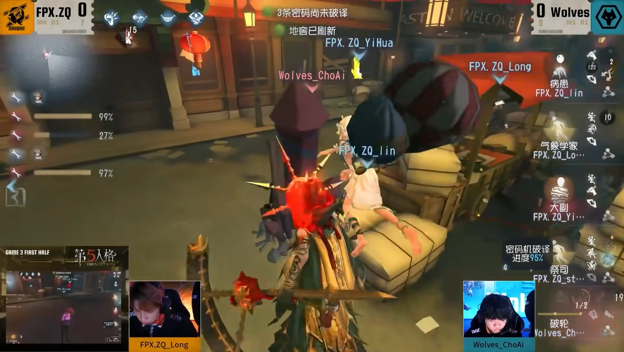 今日第三场FPX.ZQ vs成都Wolves。第三局上半局成都Wolves_ChoAi破轮开局追击大副,守椅战中监管者成功阻拦病患救援,并顺利淘汰大副。中期破轮精准穿刺消耗求生者状态,围绕密码机展开控场,最终三人开门战成都Wolves监管者逐个击破完成四抓。