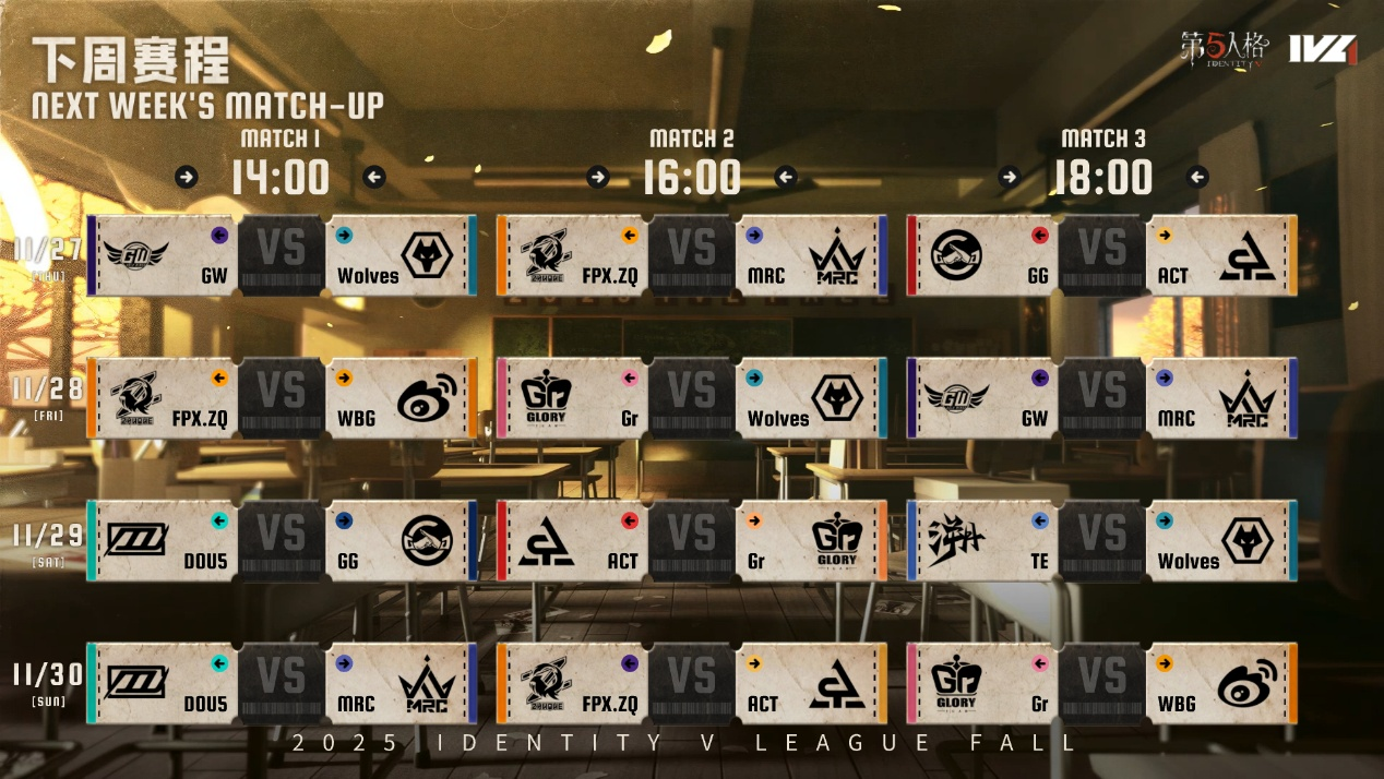 下周便是本赛季常规赛的定榜之战!风云激荡,成都GG能否有机会冲进胜者组的行列,北京WBG,成都Wolves能否稳住自己的优势位置?FPX.ZQ战队和ACT战队狭路相逢,每一分都将是通往附加赛的生死符,谁能争取到最后的附加赛资格?预祝各支战队都能取得满意的成绩,战鼓擂动,烽火昭昭,敬请锁定11月27日14:00第五人格赛事直播间,让我们一同期待最终的定榜结果!
