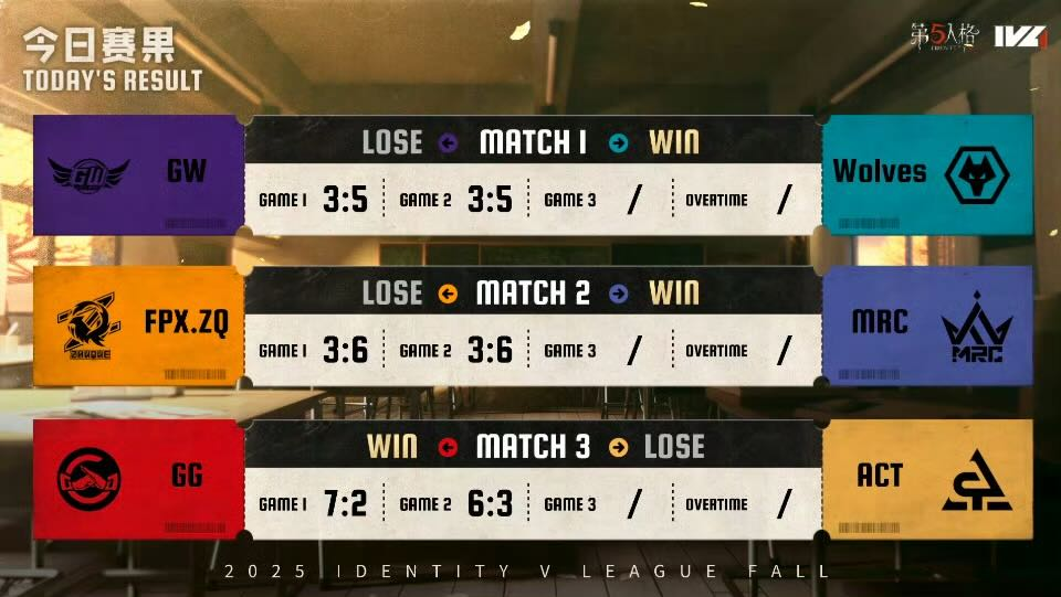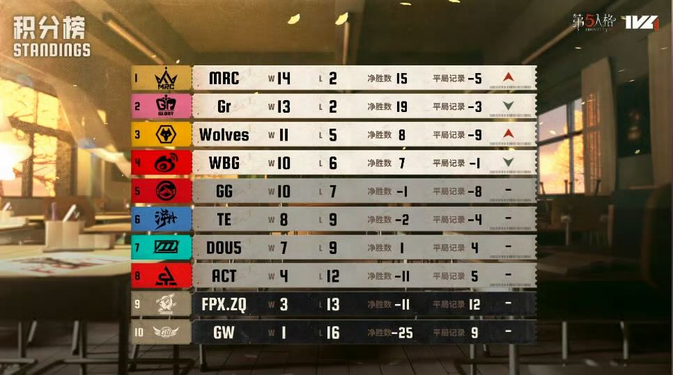 常规赛第九周第一日的比赛真是速战速决,出人意料。成都Wolves对战GW,两队战绩实力相差较大,最终狼队不出所料速战速决以2:0拿下今日比赛;MRC今日气势如虹,监管者接连两把四抓直接奠定胜局,最终也是以2:0赢得FPX.ZQ拿下今日比赛的胜利;成都GG与ACT的对局也是毫不拖泥带水非常果决,以成都GG监管者的两把四抓赢得今日比赛。