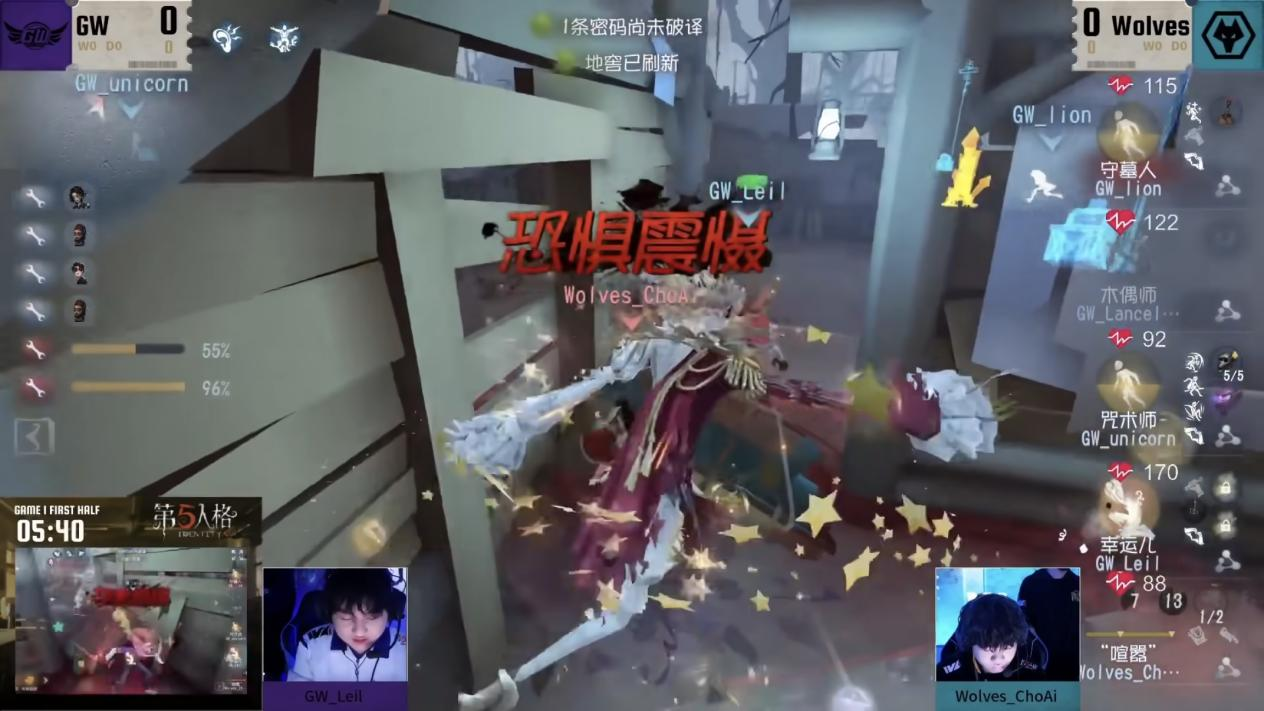 今日第一场GW vs 成都Wolves第一局上半局Wolves_ChoAi“喧嚣”开局快速击倒木偶师,中期“喧嚣”精准爆弹消耗求生者状态,三人开门战幸运儿及守墓人被留下,最终成都Wolves监管者完成三抓。
