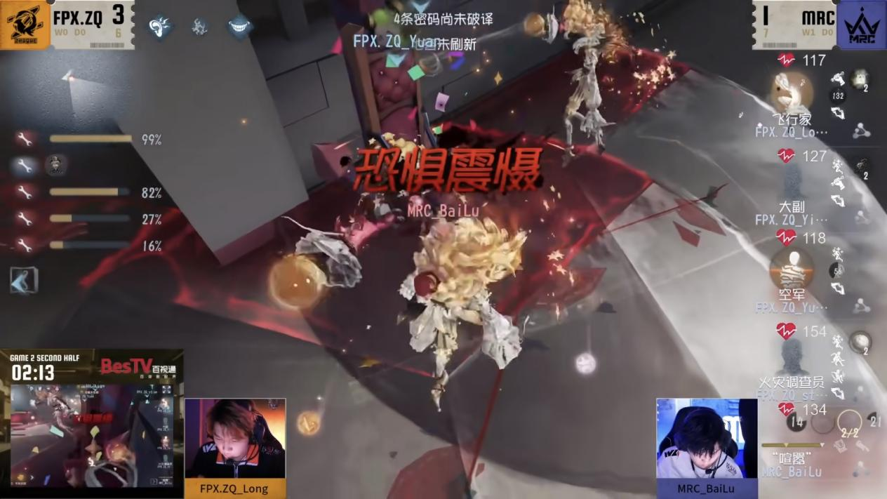 今日第二场FPX.ZQ vs MRC第二局下半局MRC_BaiLu“喧嚣”开局追击空军,守椅战监管者成功恐惧震慑阻拦飞行家救援,中期“喧嚣”精准爆弹消耗求生者状态,最终MRC监管者逐个击破完成四抓。