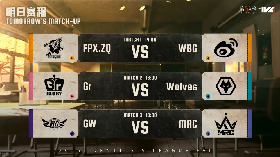 秋季赛第九周的第一日的比赛已经全部结束。MRC的胜利维持了积分榜榜一的排名,成都Wolves保住前三。明日FPX.ZQ对战WBG,前者积分垫底、后者稳居第四,实力差距明显的对决里,FPX.ZQ能否抓住机会拿分?Gr对阵Wolves,两支强队目前排名紧邻,这场交锋会否改写前四的排位?GW挑战积分榜榜首的MRC,巨大的实力差距下GW能否逆风翻盘在强敌面前打出惊喜表现?让我们一起期待明天的比赛!