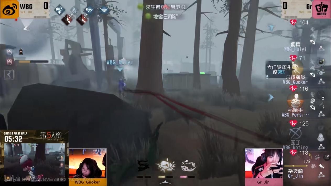 Gr vs 北京WBG 第二局上半局,北京WBG求生者园丁体系成功保平:开局杂货商追击园丁,WBG_koting园丁首先拆除角落点位的两把狂欢之椅。此后虽然杂货商通过精准碎石命中和压迫走位,不到一分钟就击倒园丁,但由于园丁携带三假寐天赋且倒点远离狂欢之椅,加上前期拆除椅子,监管者需要进行修复,拖延了大量时间。WBG_koting园丁被一救后进入角落二次牵制,再次上挂时密码机超过三台半。WBG_Huiyi佣兵稳定压满救下园丁开出化险为夷,园丁被淘汰后密码机进度仅差半台。杂货商底牌切传送击倒杂技演员挂在地下室,一轮救援后进入三人开门战,但弓箭手被快速击倒。杂货商传送小门争多抓,WBG_Huiyi提前拉点,又故意露出行踪吸引监管者,运用护腕配合灵活走位躲避藤蔓,成功出门,为杂技演员争取到开门时间,北京WBG求生者成功保平。