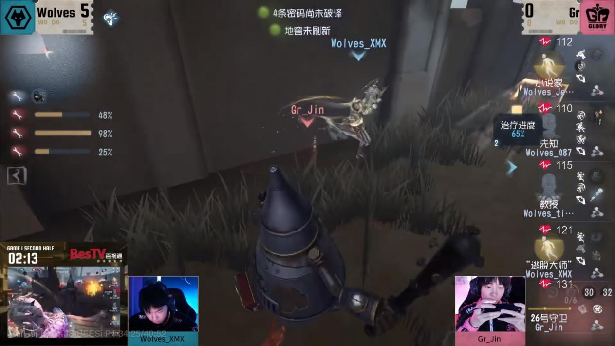 第二天Gr vs 成都Wloves第一局下半局,成都Wolves求生者配合默契,接力牵制乘胜追击:开局邦邦追击小说家,精准连雷,小说家被快速击倒。密码机进度一台半。“逃脱大师”将狂欢之椅换至大房附近,让小说家可以借助地形二次牵制,邦邦选择换追“逃脱大师”。“逃脱大师”在空地灵活走位躲避四连雷后成功交出鳞片,拖延充足时间,被击倒时小说家已经调整好状态,密码机进度达到三台。小说家套鸟救人,惊险博弈,极限卡半无伤救下,开出化险为夷。“逃脱大师”转移狂欢之椅,教授假意救人被拦,吸引邦邦向外围追击,实则小说家偷偷救下“逃脱大师”进入四人开门战。开门战小说家上椅后被先知偷偷救下,后先知飞轮躲炸成功地窖逃脱。