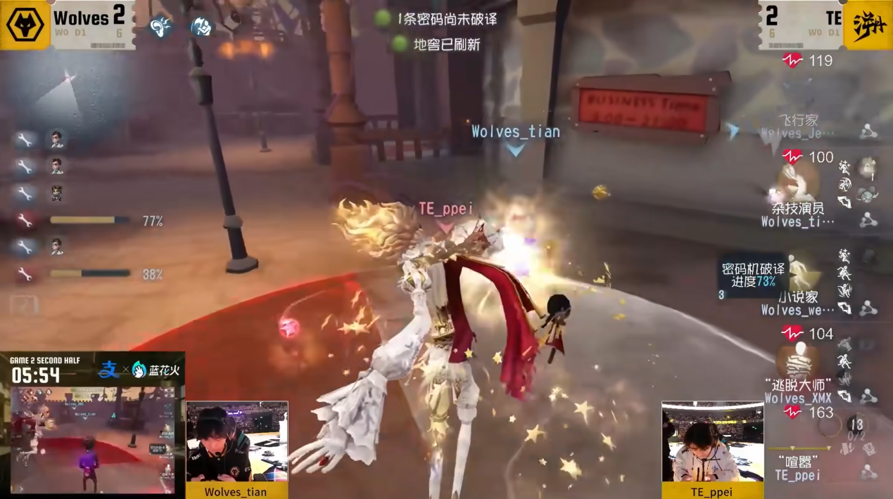 成都Wolves vs TE第二局下半场,TE_ppei“喧嚣”开局追击Wolves_Jelly飞行家,Wolves_Jelly从惊叫屋拉点,利用飞行器顺利上到河边滑梯,TE_ppei利用双重惊喜在滑梯附近进行架点,成功拿到伤害。在V型板区Wolves_Jelly假装进板实则拉开身位,TE_ppei利用空中飞人快速跟上,并使用焰火舞台封锁飞行家技能使其浪费一次喷气背包,快速将飞行家击倒。上挂一瞬间通缉到准备救援的“逃脱大师”,Wolves_XMX释放迷烟炉与监管者斡旋,并成功砸板命中监管者,Wolves_weather小说家果断进行补救,虽然没有化险为夷,但小说家利用隐喻将监管者和飞行家的距离拉开,逼出监管者移形,为己方获得一定收益。“逃脱大师”进行二次救援,但在将人救下后被TE_ppei利用分身触发搏命挣扎,飞行家也在板区博弈期间,自身羸弱以及干冰标记的双重交互debuff下被抽刀击倒。在淘汰飞行家后,TE_ppei快速锁定倒地的”逃脱大师“的位置,续上二次节奏。Wolves_XMX使用逃脱术将自己换位至惊叫屋内,TE_ppei未能第一时间捕捉其动向,给Wolves_tian杂技演员无伤救人的机会。击倒”逃脱大师”后,TE_ppei直接底牌切传送管控密码机,将小说家击倒留在遗产机附近。TE_ppei在击倒小说家后,将其牵往惊叫屋方向,见半状态“逃脱大师”仍在破译密码机,果断放下小说家进行追击,继而拦截准备救援的杂技演员。TE_ppei利用空中飞人跳至二楼,仅在6秒内快速将满状态杂技演员击倒,此时小说家刚刚触碰到73%的遗产机,杂技演员未能成功救人并被上挂,“逃脱大师”随着时间的流逝而被淘汰,TE_ppei最终确定小说家位置,收割四抓。整场对局追击节奏紧凑,监管者利用求生者倒地不上挂拖延求生者破译密码机的时间,以及牵制时长的不确定性让求生者方难以抉择是直接半状态破译密码机还是互补状态,以至于求生者方只能俯仰由人,选择保守的运营方式,进而导致再次失去对局面的掌控力。