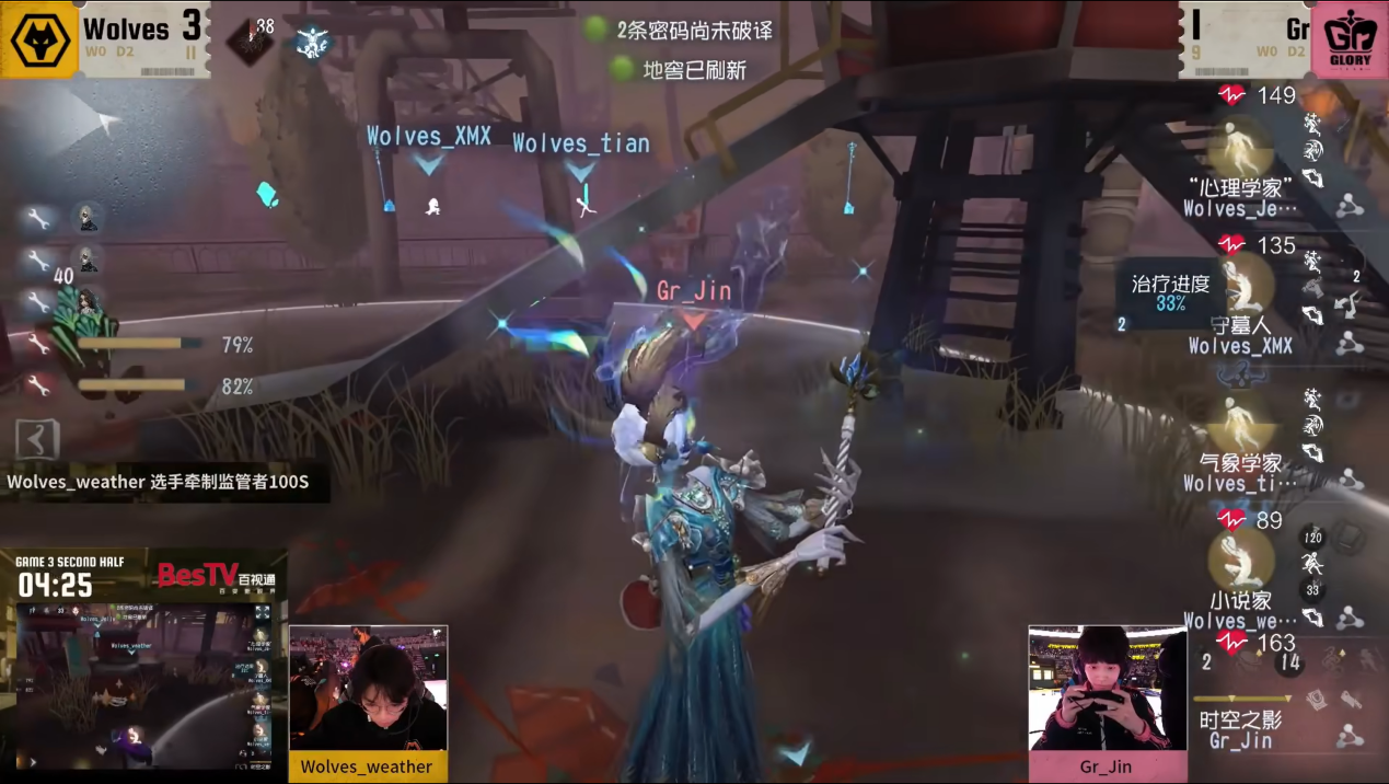 Gr vs 成都Wolves第三局下半场,Gr_Jin时空之影开局释放伊斯人前往马戏团寄生Wolves_tian气象学家,Wolves_tian利用强风和层云拉开身位,逼迫监管者闪现开刀。Wolves_weather小说家在一旁准备辅助,成功吸引监管者注意力,使得气象学家拉开足够远的距离,“心理学家”趁机为其移情,补满状态。Gr_Jin尝试再次追击气象学家却不见其人,手中没有快速终结小说家的技能,只能和Wolves_weather隔着终点站站台遥遥相望,Wolves_weather再次呼叫“心理学家”移情,极限回满状态并利用隐喻加速叠加板窗双弹射拉开距离保证自己的安全。Gr_Jin利用寄生并传送至陶片对小说家造成僵直,虽然Wolves_weather不可避免吃到伤害,但快速转动视角规避本体的异族本相,为自己创造继续牵制的空间。Gr_Jin在一番追击后终于锁定了没有道具正在修机的气象学家并将其快速击倒,挂至遗产机附近,但此时场上密码机进度已经将近四台。Wolves_XMX再次展现极其稳定的大心脏,在侵蚀领域、双重异族本相以及淘汰进度的压迫下,成功将人救下,但奈何侵蚀度过高,还是被拿到伤害触发搏命挣扎。因为Gr_Jin在守椅阶段误将伊斯人寄生在气象学家身上,导致在攻击守墓人过后,不能追上已经利用擦刀跑远的气象学家,Gr_Jin审时度势,选择继续守住遗产机,同时抓住准备来修机,身位却贴得太近的小说家的破绽,快速将其击倒后,即刻目标锁定倒地守墓人的方向,镜头的扭转已然显现出他接下来的目标:直接传送挂上守墓,连打两人倒地,同时核心战场围绕活木马密码机铺陈开来,直接将守椅节奏掌握在自己手内,气象学家没有直接点亮密码机,导致自己也被击倒,伊斯人监控守墓人周围动向拦截准备救人的小说家,“心理学家”陷入进退两难的境地:距离不够不能将气象学家救下,如果选择去点亮密码机,但小说家没有携带回光返照对局面也无济于事,最终Gr_Jin扭转局势,强力四抓,点燃全场!