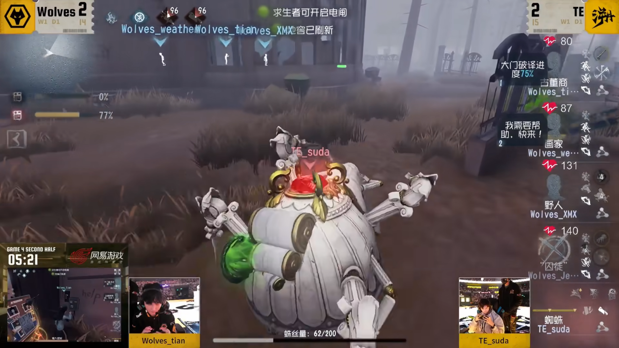 第四局下半场来到圣心医院,TE_suda蜘蛛开局追Wolves_Jelly“囚徒”,求生者方开局便采取“轮番辅助”的策略,Wolves_Jelly在医院正门下板主动制造封闭长板区进行牵制,Wolves_XMX野人及时骑乘野猪就位,在蜘蛛使用闪现对“囚徒”造成伤害擦刀结束后,冲撞为“囚徒”拉开巨大身位。紧接着Wolves_weather画家就位帮助卡板,在陪跑过程中记录监管者样貌并绘制画板,“囚徒”也顺利来到Wolves_tian古董商的辅助范围内,经过三人的接力帮助,虽然古董商和画家的状态有所下降,但关键的救人位野人依然是满状态,外围密码机进度也已经足以支撑求生者方压满将人救下的决策。在冲出地下室的阶段,野人成功帮助“囚徒“抗到落地刀,Wolves_Jelly也及时转往交互点扯丝,避免被吐丝压住起身,画家也已经贴好侧门,能在电闸通电后立刻破译大门。开门站阶段,因为“囚徒”身上蛛丝缠绕过多,交互速度较慢,在翻窗时被击倒,另外三人紧急部署,换由古董商点门,画家和野人拉开止戈范围,确保即使监管者传送落地,古董商三连机关箫一定能将门点开,另外两人亦各有自保手段能逃出生天,最终三跑还回比分。