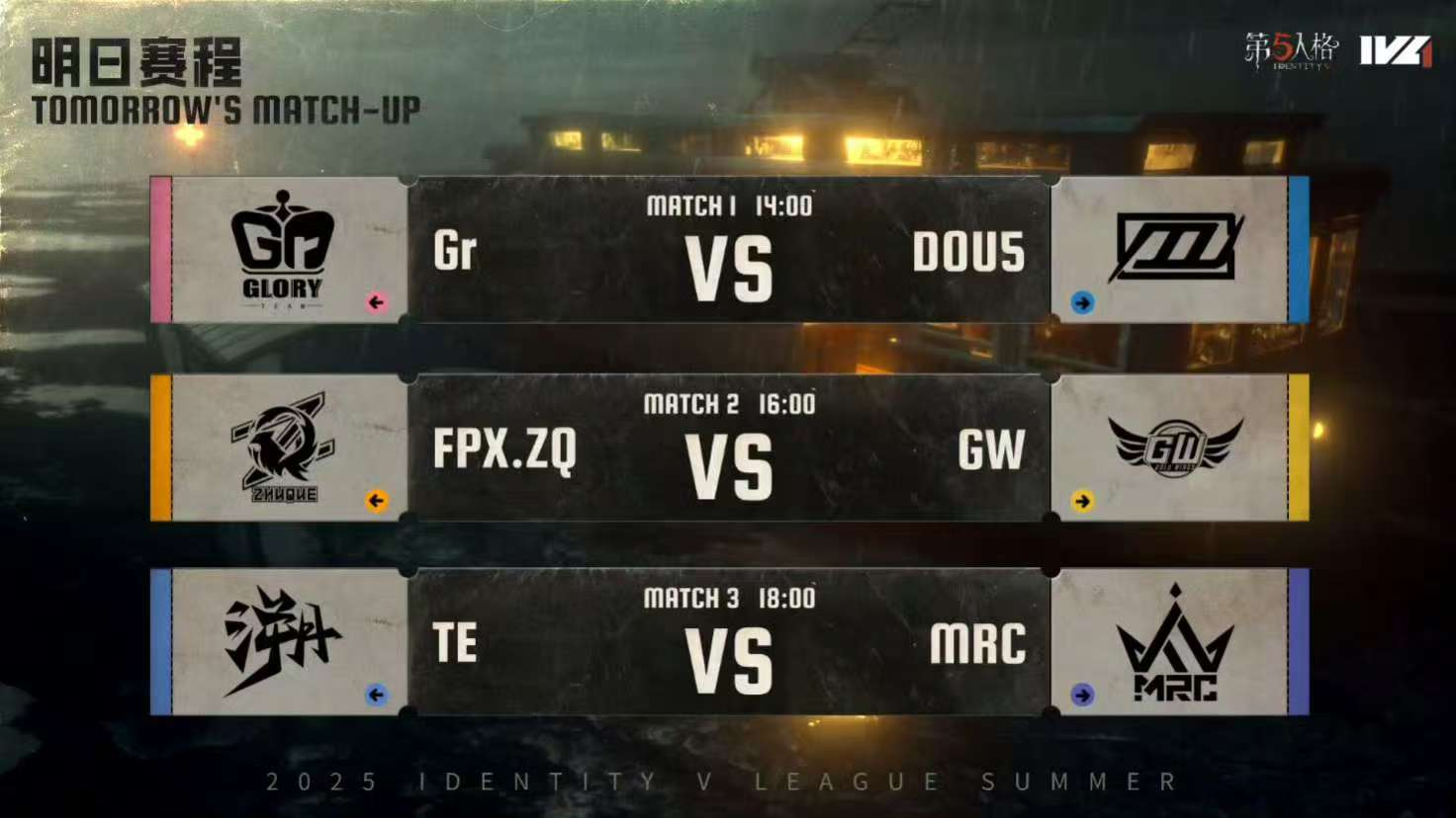 夏季赛第九周第一日的比赛已经全部结束。明日Gr对战DOU5,两队将为我们带来怎样的精彩博弈?FPX.ZQ与GW的对局中,究竟是FPX.ZQ稳扎稳打,再积一分?还是GW双阵营共同发力,赢取胜利?TE与MRC的再度对决,谁会是最后赢家?明日积分榜又会发生什么样的变化呢?让我们拭目以待!