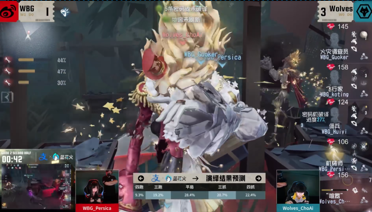 今日第三场北京WBG vs 成都Wolves。第二局下半局北京WBG_Persica“机械师”全局牵制122s。成都Wolves_ChoAi“喧嚣”开局追击机械师,中期机械师灵活牵制精彩板区博弈争取破译时间。守椅战中机械师操纵机械玩偶抢修密码机,三人开门战最终北京WBG求生者完成三跑。