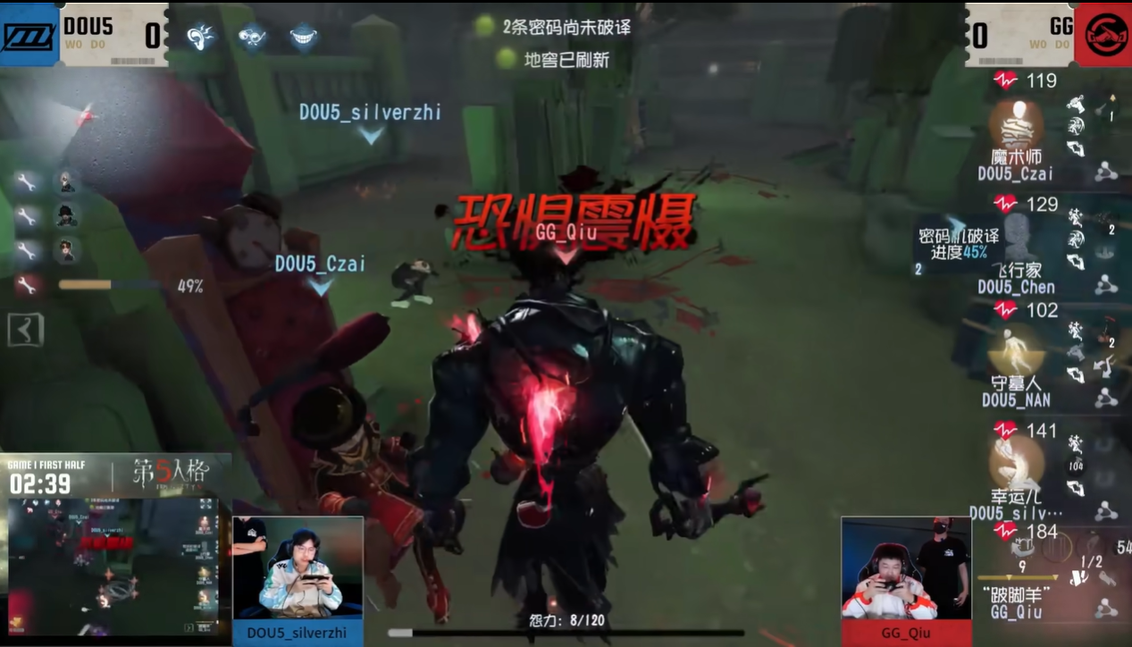今日第二场成都GG vs DOU5。第一局上半局成都GG_Qiu“跛脚羊”开局闪现快速击倒魔术师,守椅战监管者恐惧震慑幸运儿,成功打出双倒。中期“跛脚羊”利用牢笼不断消耗求生者状态,最终成都GG监管者逐个击破完成四抓。