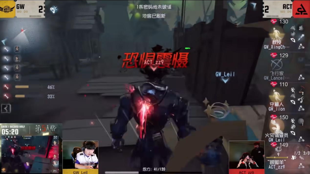 今日第一场ACT vs GW。第一局下半局ACT_zz9“跛脚羊”开局追击飞行家,击倒并将其挂至地下室。中期“跛脚羊”精准牢笼迅速击倒教授,双方围绕密码机展开博弈,监管者利用牢笼成功恐惧震慑火灾调查员。最终ACT监管者逐个击破完成四抓。