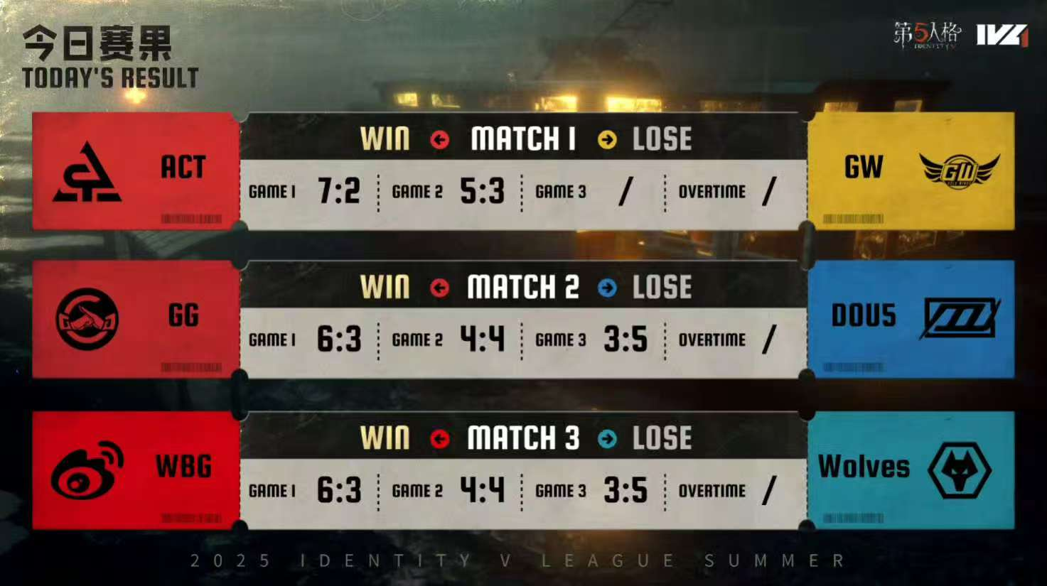 2025年IVL夏季赛常规赛第九周的第一天的比赛已经结束,最终ACT、成都GG、北京WBG赢得了比赛的胜利,让我们回顾一下今天的对决: