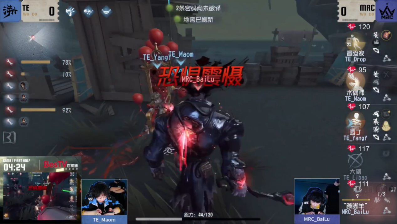 今日第三场TE vs MRC。第一局上半局MRC_BaiLu“跛脚羊”开局快速击倒大副,中期“跛脚羊”利用牢笼不断消耗求生者状态,守椅战中监管者恐惧震慑木偶师成功拦截救援,最终MRC监管者逐个击破完成四抓。