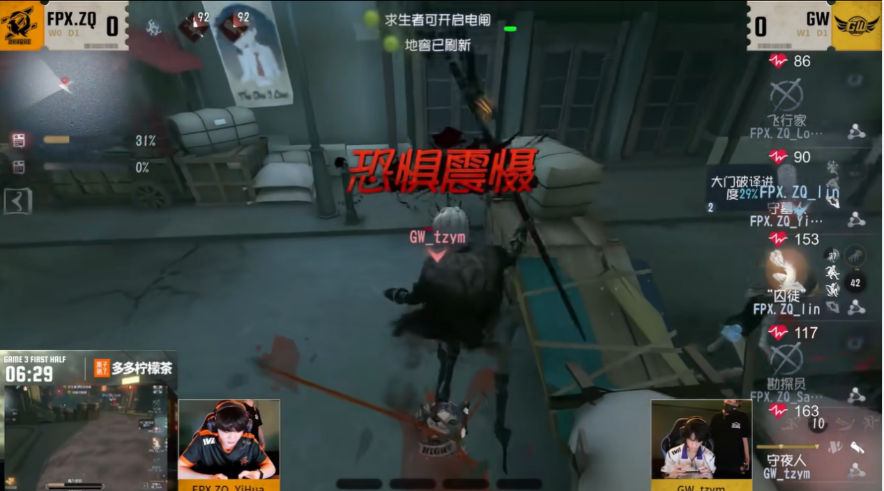 今日第二场FPX.ZQ vs GW。第三局上半局GW_tzym“守夜人”开局快速击倒飞行家,守椅战监管者果断切换底牌传送成功阻拦勘探员救援,并打出双倒。中期守夜人围绕密码机展开控场并不断消耗求生者状态,利用远袭拦截“囚徒”救援。二人开门战恐惧震慑囚徒,最终GW监管者逐个击破完成四抓。