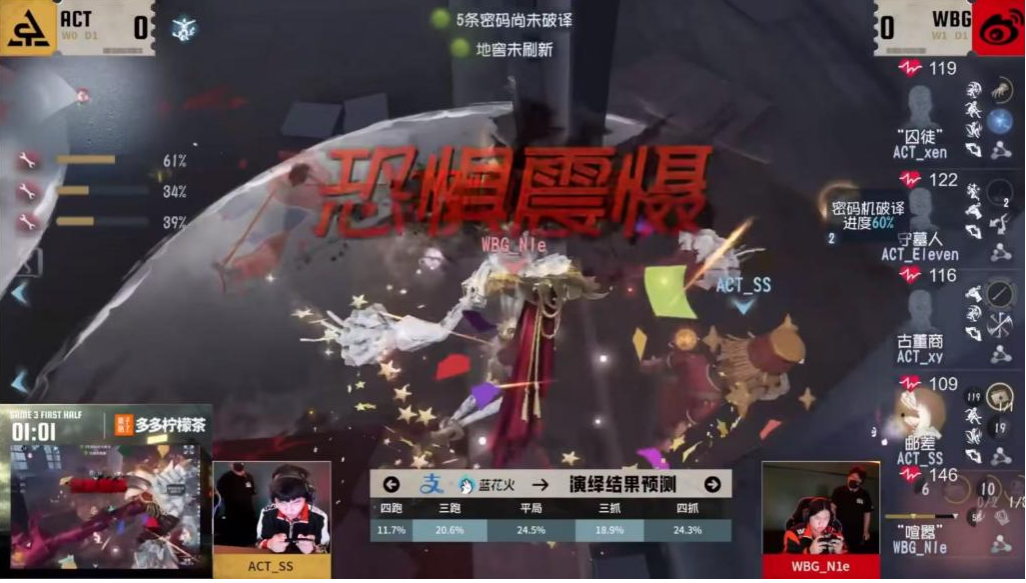 今日第二场北京WBG vs ACT第三局半局WBG_N1e“喧嚣”开局快速击倒邮差并打出恐惧震慑,中期“喧嚣”精准爆弹消耗求生者道具和状态,守椅战监管者成功阻拦求生者救援成功打出双倒节奏奠定多抓局势,最终北京WBG监管者逐个击破完成四抓。