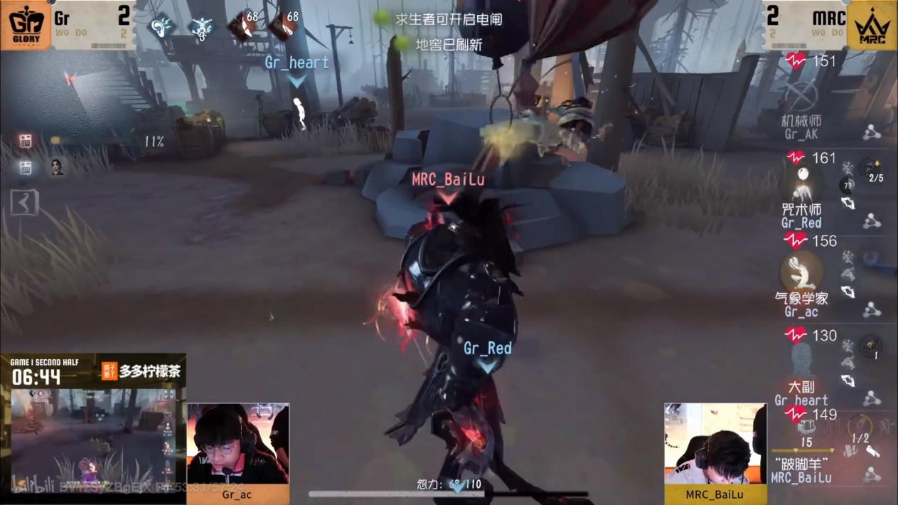今日第一场MRC vs Gr第一局下半局,MRC_BaiLu“跛脚羊”,三人开门战四抓:开局MRC_BaiLu“跛脚羊”追击机械师,双牢笼在开局35s即完成击倒,并利用气球刀处理掉玩偶。机械师被救下后进行了二次牵制拖延时间并放出玩偶辅助修机,机械师被淘汰后密码机进度只差一台。MRC_BaiLu凭借敏锐嗅觉和精准排点,直接找到半状态大副将其击倒挂进地下室无缝续上节奏。MRC_BaiLu果断底牌切传送,进一步控场小号道具扩大优势。而求生者则抓住监管者换挂的机会,接力牵制拖延时间,争取到三人开门战。MRC_BaiLu击倒气象学家后又击倒咒术师,骗大副回来运营,放下咒术师骗出怀表后又转而追击交自愈的气象学家。咒术师被挂上后,大副仍在追击范围内,MRC_BaiLu“跛脚羊”完成四抓。