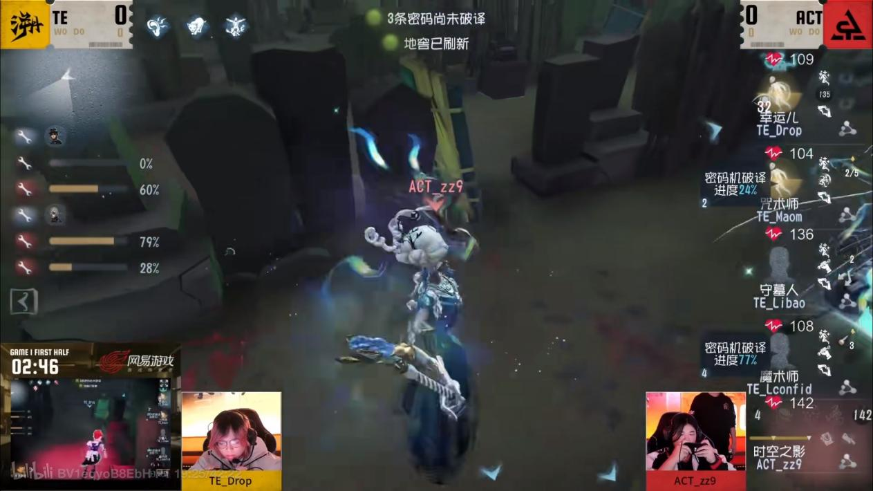 今日第三场ACT vs TE 第一局上半局,TE_Drop幸运儿与队友接力牵制争三出:开局时空之影在地图角落追击TE_Drop幸运儿,TE_Drop及时利用香水规避伤害转入墓地进行牵制。TE_Drop选择主动回头叠侵蚀度避免被高侵蚀度闪现后被迅速击倒。TE_Maom有意叠侵蚀度吸引监管者追击,让幸运儿得以拉出闪先身距,时空之影进入双人同时压迫的追击状态,但是无法将人击倒,幸运儿进入板区持续牵制,被最终击倒时密码机进度已超过四台。监管者被迫换追守机控场消耗道具,选择在开门战前交出闪现,导致开门战只能击倒守墓人将其淘汰,面对带枪的幸运儿和四层猿猴咒像的咒术师无力回天,TE求生者完成三出。