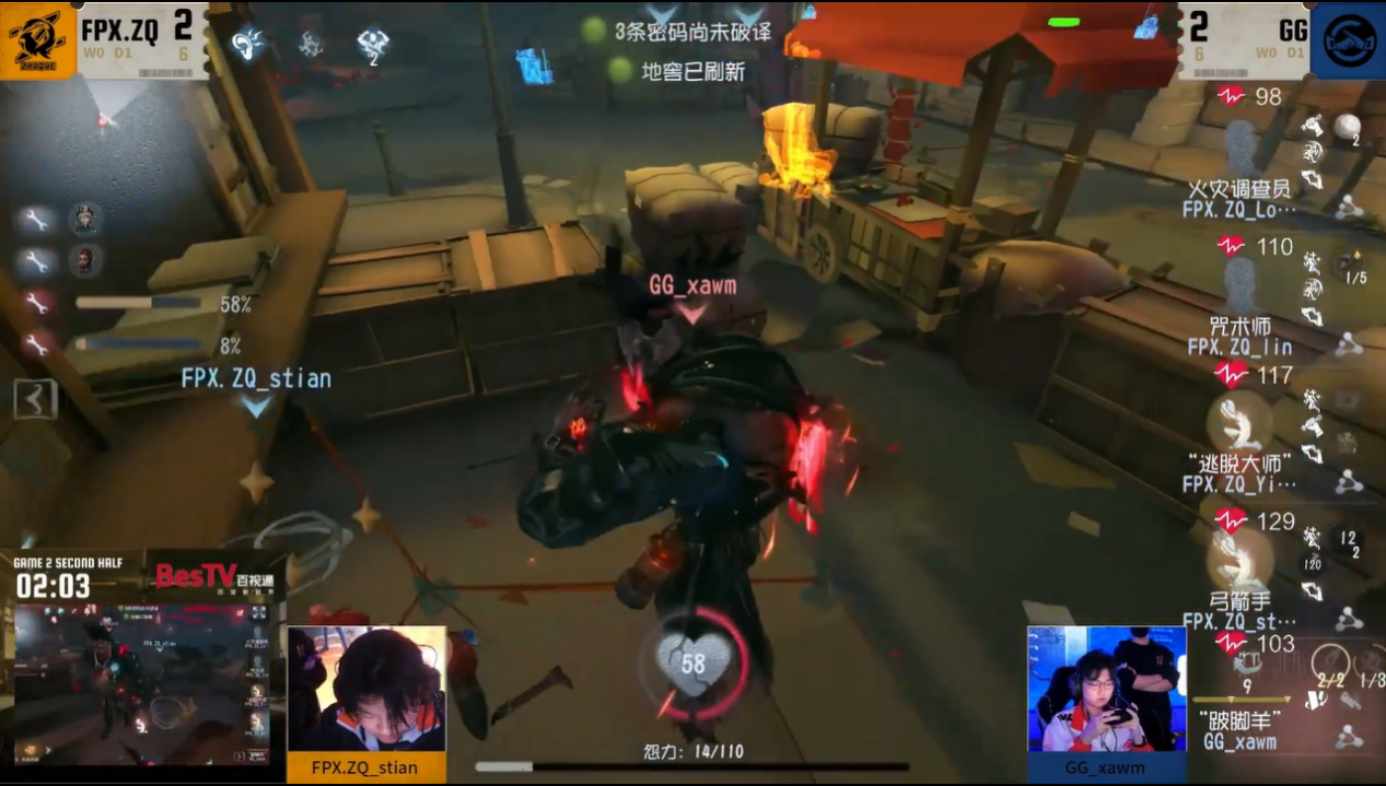 今日第三场FPX.ZQ vs成都GG。第二局下半局成都GG_xawm“跛脚羊”开局追击“逃脱大师”并将其击倒,守椅战中监管者成功打出求生者双倒,后期“跛脚羊”利用牢笼消耗求生者状态并围绕密码机展开控场,最终成都GG监管者逐个击破完成四抓。