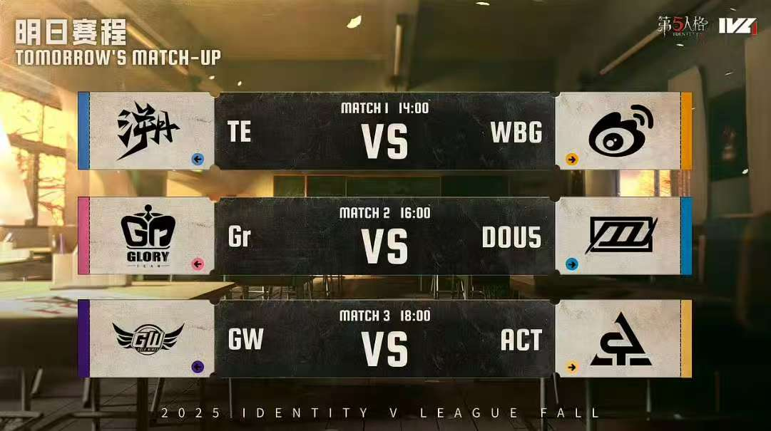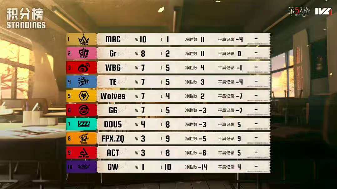 秋季赛第六周第二日的比赛已经全部结束,常规赛赛程已过大半,MRC稳居积分榜榜首。明日将由TE对战北京WBG,榜三榜四之争,究竟鹿死谁手?在DOU5与Gr的对决中,DOU5能否调整好队伍状态,从Gr手中争下一分?GW与ACT两队积分排名稍稍落后,哪支战队能够赢下比赛获得这一宝贵积分?明日积分榜又会发生什么样的变化呢?让我们拭目以待!