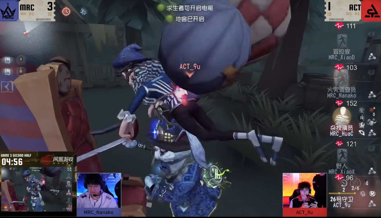 今日第一场ACT vs MRC。第三局下半局ACT_9u邦邦开局追击杂技演员,中期杂技演员灵活走位躲避炸弹为队友争取破译时间,守椅战求生者稳定救援,四人开门战杂技演员被留下,最终MRC求生者完成三跑。