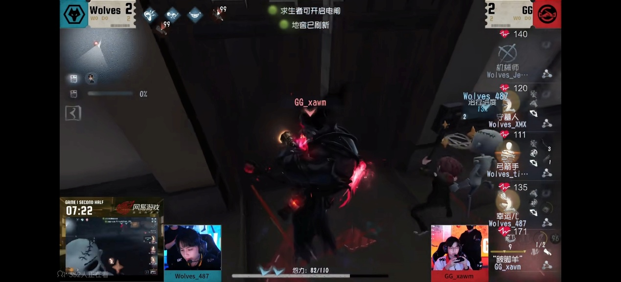 今日第二场成都GG vs 成都Wolves第一局下半局GG_xawm“跛脚羊”开局追击机械师,并利用气球刀击倒机械玩偶。淘汰机械师后,中期”跛脚羊“利用牢笼消耗求生者状态,后期双方围绕密码机展开拉扯,最终三人开门战,”跛脚羊“击倒守墓人后果断传送,侧刀命中幸运儿,成都GG监管者完成四抓。