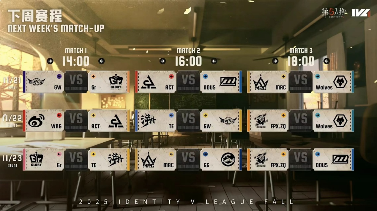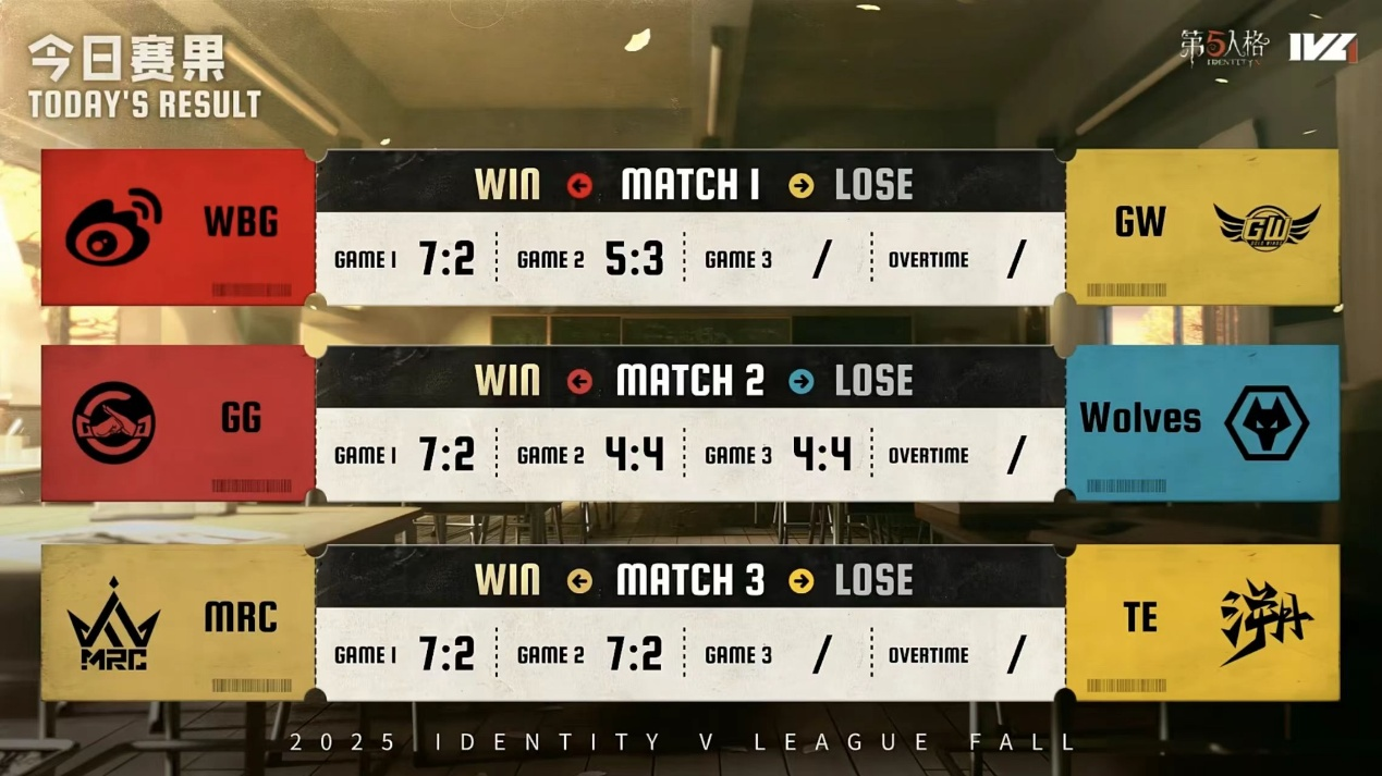 秋季赛第七周第三日的比赛已经全部结束。MRC继续霸榜积分榜榜首,WBG战队也牢牢占据积分榜榜三的位置,成都GG战队取得今日的胜利后也进入积分榜前四!下周排名相近的ACT战队将和DOU5战队直接交手,究竟谁能取得这关键的一胜?成都Wolves在经历本周的失利后下周能否重整旗鼓赢得比赛冲击胜者组?MRC战队也将面对近期状态火热的成都GG战队。让我们一起期待第八周的比赛!敬请锁定周五下午14:00的第五人格赛事直播间。