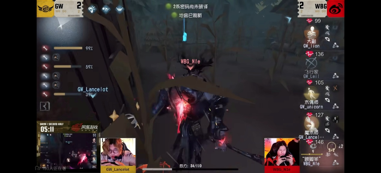 今日第一场北京WBG vs GW第一局下半局,WBG_N1e“跛脚羊”开局先逼大副的道具,随后换追飞行家并迅速击倒,守椅战大副和木偶师稳定救援两次。淘汰飞行家后,中期“跛脚羊”果断传送击倒大副并挂至地下室,成功拦截魔术师救援,最终北京WBG监管者逐个击破完成四抓。