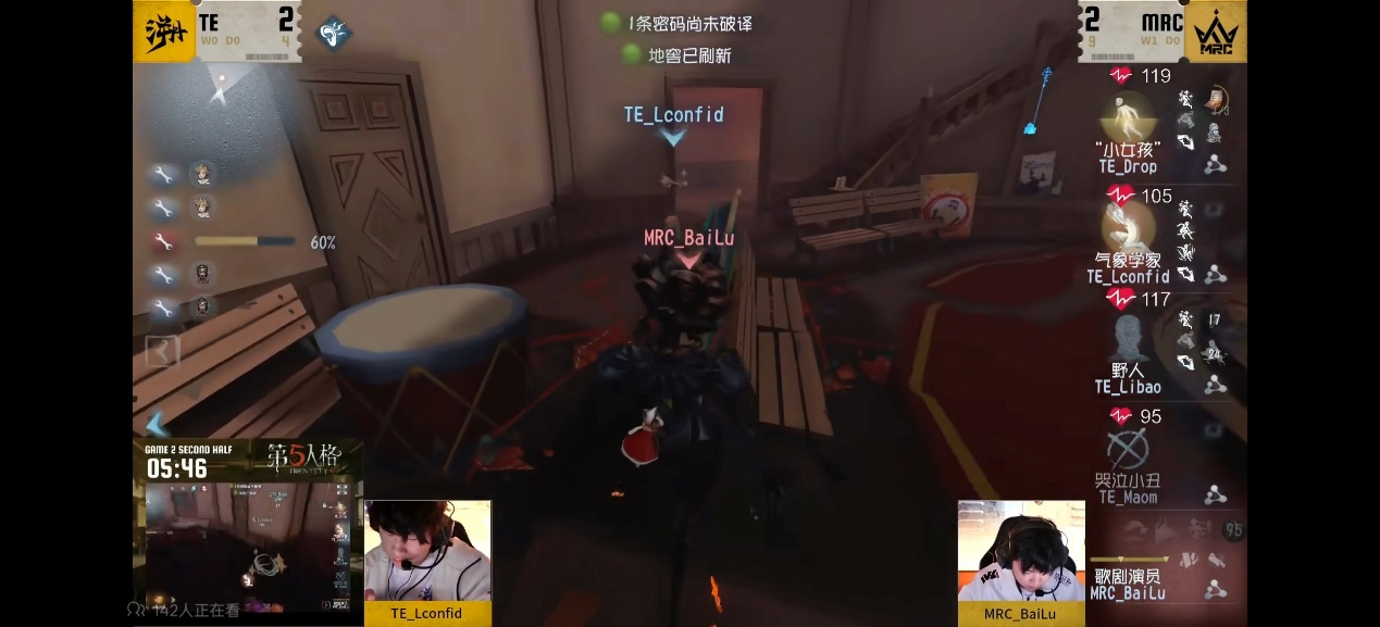 今日第三场MRC vs TE第二局下半局MRC_BaiLu歌剧演员开局追击哭泣小丑,守椅战监管者成功打出双倒节奏,中期歌剧演员消耗求生者状态并干扰破译进度,利用传送和强追击能力使得求生者疲于奔命,最终两人开门战MRC监管者逐个击破完成四抓。