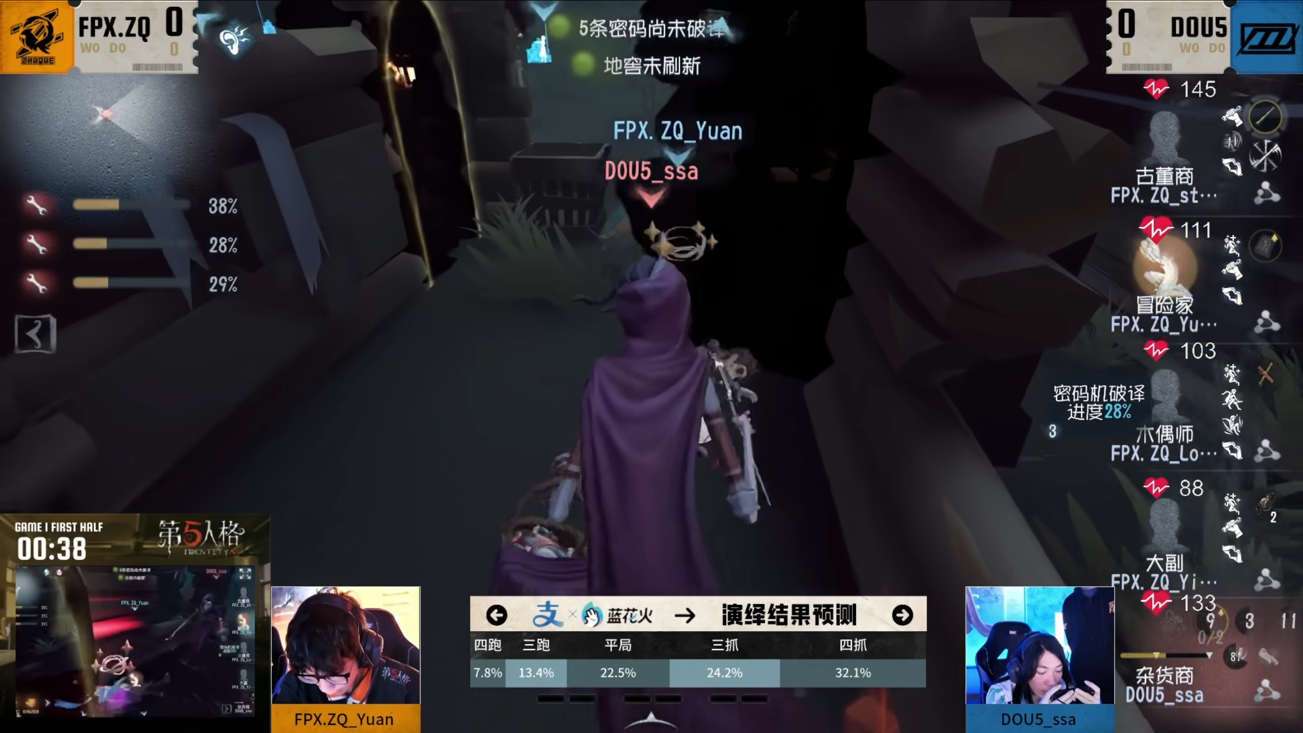 FPX.ZQ vs DOU5第一局上半场,DOU5_ssa杂货商灵活应变,:地图湖景村,监管者杂货商。开局DOU5_ssa杂货商在小门外成功抓住蹲藏的冒险家,两波碎石压迫走位,开局仅38s便实现击倒,守椅环节稳扎稳打,两次救人都打出了一炸一刀的伤害,且没有给到冒险家二溜机会,求生者状态不佳,密码机停滞。中期挂飞冒险家后,DOU5_ssa杂货商选择传送追击FPX.ZQ_Long木偶师,击破骗出木偶师变身路易消耗状态后成功击倒,待二救时,求生者状态不佳且距离较远,无人能来救援,最终两人拉扯,监管者击倒挂上古董商,成功排到试图跳地窖的大副,最终监管者摧枯拉朽拿下四抓。