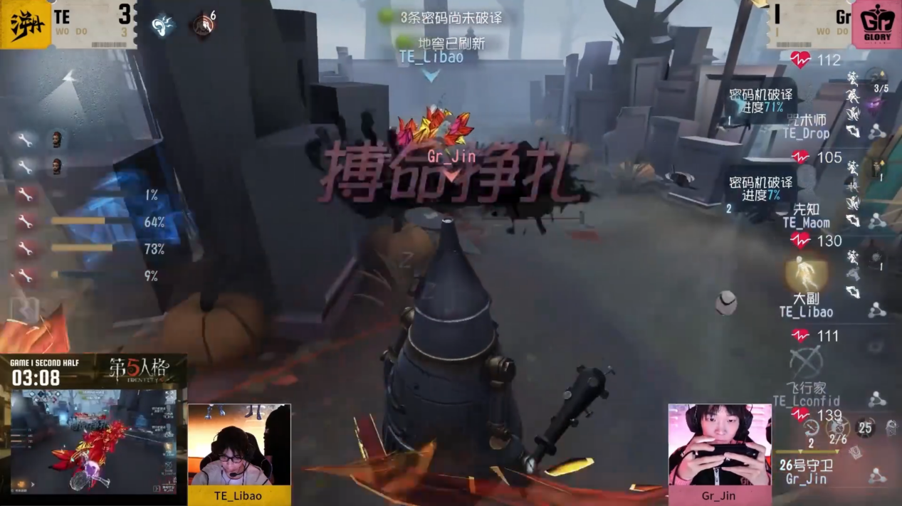 Gr vs TE第一局下半场,Gr_Jin26号守卫追击拉扯两手抓,蚕食求生强势四抓:地图红教堂,监管者26号守卫。开局Gr_Jin26号守卫在中场追击TE_Maom先知未果,选择换追TE_Lconfid飞行家,精准二连雷预判飞行家落点,狭窄地形再次二连雷至半状态,交互雷再配合移形实现快速击倒并挂至地下室,TE_Libao大副卡半救下飞行家给到二溜空间,但Gr_Jin26号守卫无视野二连雷预判走位击倒飞行家,求生者状态不佳选择卖掉保平。中期监管者追击大副,远程二连配合遥控雷压低大副状态,大副摇表但无奈26号守卫熟练度拉满,精准三连雷击中摇表中的大副,快速续上二手节奏,咒术师无伤一救下大副,但大副没有道具难以二溜,且被挂到中场地下室,求生方遗产机也在中场,监管者控机守椅同时进行,高熟练度连雷频繁消耗求生状态,最终密码机进度97%击倒全部求生,严密的拉扯顺利拿下四抓。