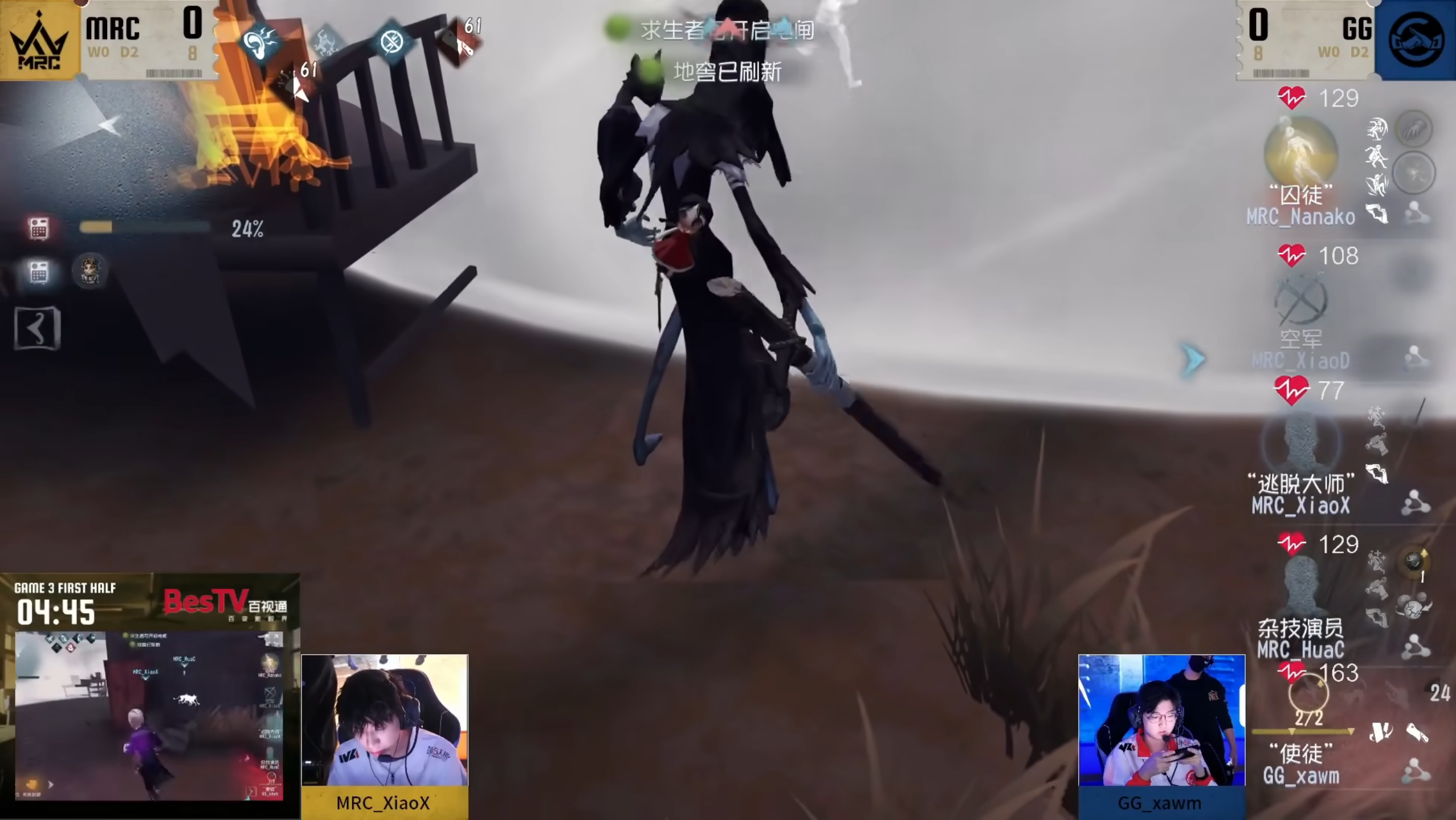 MRC vs 成都GG第三局上半场,GG_xawm“使徒”细节卡过半,MRC_XiaoX关键驰援率队三跑破冰:地图圣心医院,监管者“使徒”。开局GG_xawm“使徒”在医院追击MRC_XiaoD空军,精准预判反绕配合放猫晕眩快速拿到第一刀,空军吃刀围绕大房牵制配合“囚徒”辅助成功转点至小门废墟,监管者移形拉进身位后击倒。挂上空军后,“使徒”拉猫晕眩杂技演员成功将空军卡过半,杂技演员只能继续陪跑扛刀,成功卡位扛刀,让空军可以围绕医院继续牵制,待击倒时,密码机只剩最后半台,求生者的配合成功挽救救人失误带来的劣势。开门战,“使徒”在T墙追击“囚徒”,MRC_XiaoX“逃脱大师”灵性换椅换至小门附近,并利用被动成功救人套出化险为夷,完成一场精彩的三人三跑。