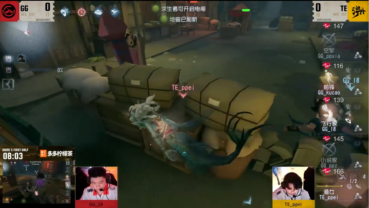第五局上半局TE_ppei渔女开局追击小说家并稳定击倒,中期双方围绕密码机展开拉扯,不断干扰求生者破译进度。守椅战渔女精准把控水汽成功阻拦空军救援,三人开门战空军及飞行家被留下,最终TE监管者完成三抓。