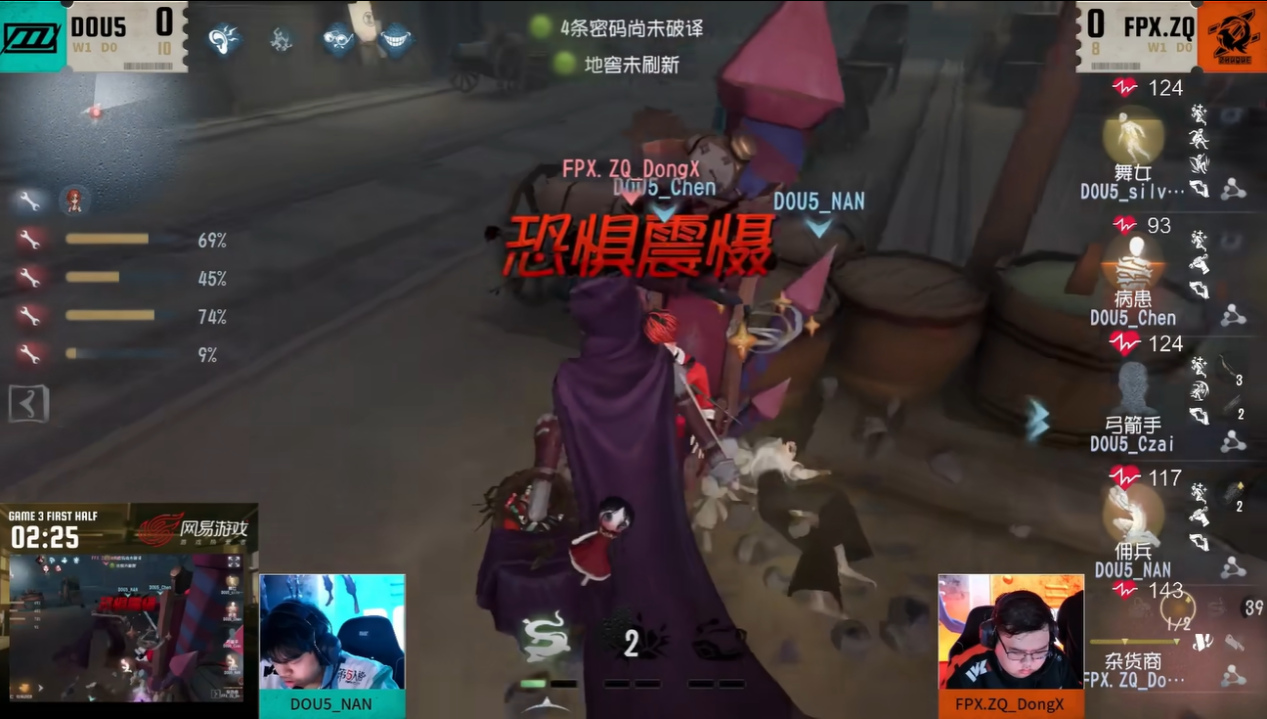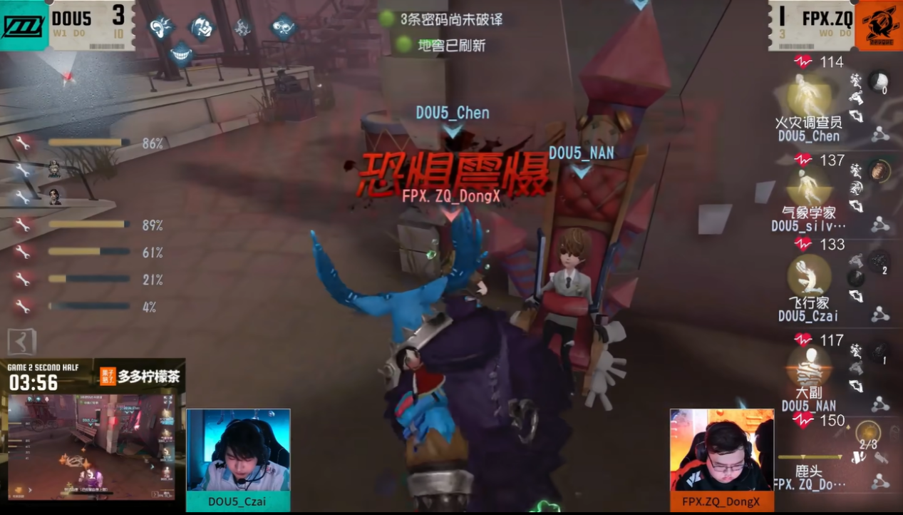 今日第二场DOU5 vs FPX.ZQ。第二局下半局FPX.ZQ_DongX鹿头开局追击气象学家,守椅战监管者拦截飞行家将其击倒,成功恐惧震慑阻拦火灾调查员救援,中期鹿头利用链爪消耗求生者状态并干扰破译进度,最终FPX.ZQ监管者逐个击破完成四抓。